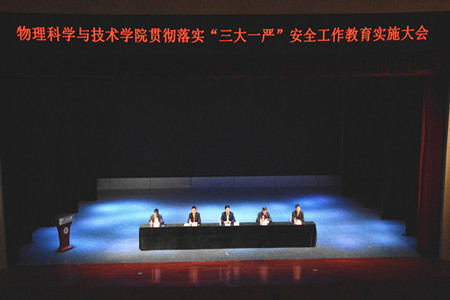 4月21日下午,物理胜游体育(中国)官方在线全体师生齐聚学校大礼堂,隆重举行贯彻落实“大教育、大普查、大整治、严管理”安全工作教育实施大会。学校党委保卫部、武装部部长、安全管理处处长丁立波应邀作安全教育报告,学院班子成员出席大会。会议由学院副院长陈刚主持。