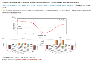 基于出色的阅读量和下载量表现,张昌文教授带领团队在Nanoscale上发表的论文“Strain-tunable skyrmions in two dimensional monolayer Janus magnets”,被编入Nanoscale2023年最受欢迎论文专辑,以及2024 Lunar New Year Collection 专辑。 Nanoscale是由英国皇家化学会同中国国家纳米科学中心共同出版,发表有关纳米科学和纳米技术的高质量研究报道,是领域内的一本主力期刊。论文的第一作者为2020级硕士研究生韩曰通同学,硕士毕业以后,在郑州大学物理学院继续攻读博士学位。