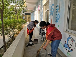 活动开展过程中,志愿者们帮助天翼的老师们打扫教室,美化环境,尽力为小朋友们营造温馨舒适的生活学习环境,虽然忙碌但快乐着。志愿者们在劳动的同时不忘跟小朋友们亲切互动,他们一起玩耍,一起学习,让孩子们感受到我们都一样的勇敢,一样的坚强。