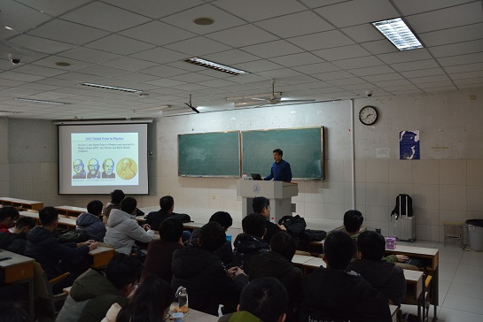 12月24日,长江学者朱宗宏教授应邀做客“泉城大讲堂”,作题为“聆听时空的震颤——引力波”的科普报告会,全校数百名学生参加,报告由物理胜游体育(中国)官方在线院长王少清主持。