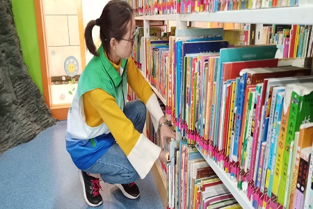 4月13日的上午,物理学院的志愿者们在领队的带领下来到了山东省少儿图书馆。每一位物理学院的志愿者都激情满满的准备帮助来这里学习的小朋友们。为了让小朋友们能够更加安全并且轻松的拿到他们感兴趣的书籍,物理学院的志愿者首先帮助图书馆的工作人员将图书整理分类并摆放整齐。当一些小朋友想要将喜爱的书籍拿回家中继续阅读时,物理学院的志愿者都会给小朋友及家长讲解借还书机器的操作方法。还有一些热情的志愿者主动给小朋友们讲有趣的故事,使他们对书中的知识更加感兴趣。
