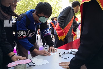 早上十点半,志愿者开们始了紧张有序的布置,谈起这个活动最初的想法,活动策划者说,“能为他人做一些事情既是我们的愿望也是我们的责任。”在游戏期间,志愿者们在人群中穿梭,为参与活动的同学们做引导,以让同学们尽快熟悉游戏规则融入游戏当中。他们为参与的同学带上眼罩,然后指引他们穿过气球阵。
