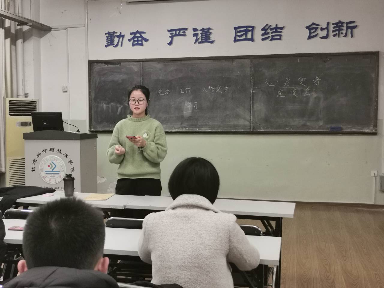 2019级新生来到大学已有两个多月的时间,对大学生活已有了初步的适应,物理学院学生的工作与学习也已步入正轨。针对刚刚过去的期中考试以及近期的工作情况,11月22日,我院心理发展服务中心于第七教学楼组织开展了“2019级班级心灵使者座谈会”与同学们进行交流研讨。