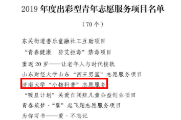 近日,共青团济南市委发布了《胜游体育2019年度济南市五四出彩典型的表彰通报》,胜游体育“小物科普”志愿服务项目荣获“出彩型青年志愿服务项目”称号。