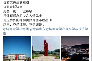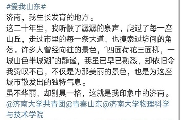 本次活动的参与形式是:登录新浪微博、抖音个人账号,搜索“爱我山东”进入主话题页面,带话题#爱我山东#,并且@青春山东,@共青团济南大学委员会-,发布短视频、Vlog、图片、文字等动态内容,发现山东之美,为山东代言。活动发布后,大家都积极参与,截止8月15日,物理学院共青团已经收到了数以百计的投稿,在学院范围内引发了一阵爱我山东的热潮。齐鲁大地,人杰地灵,景美情浓,在大家的投稿中,有“四面荷花三面柳,一城山色半城湖”的济南,有“历史悠久,风韵依旧”的聊城,有“会当凌绝顶,一览众山小”的泰安,也有“懒织蒲鞋罢养亲,入瞧瞑眼鼓烟尘”的烟台等等。