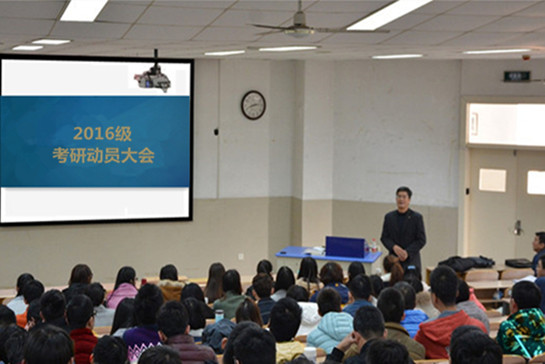 王少清院长现场统计了学生的考研意愿,并以幽默诙谐的语言讲述了为什么要考研,以及如何对待考研。他强调考研是实现梦想的最佳途径,是提升个人平台的有效方式,是实现幸福生活的最有效手段,是提高自己综合素质的有效过程。王院长同时也鼓励同学们报考本校研究生,他从专业方向、奖助体系、初试复试、就业升学、招生导师及研究方向等几个方面介绍了我院研究生的培养体系和优势。